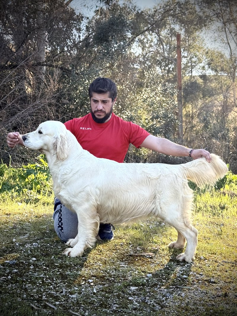 Milán fue la única niña en la pequeña camada de tres cachorros que tuvo Rose en 2024. Era un cruce que planteamos con mucha ilusión ya que en los antepasados podíamos encontrar a uno de los Golden que sembró nuestra base de cría, por lo que era una forma de traer al presente unas líneas que nos ilusionaron mucho y que nos dieron años de amor inconmensurable.